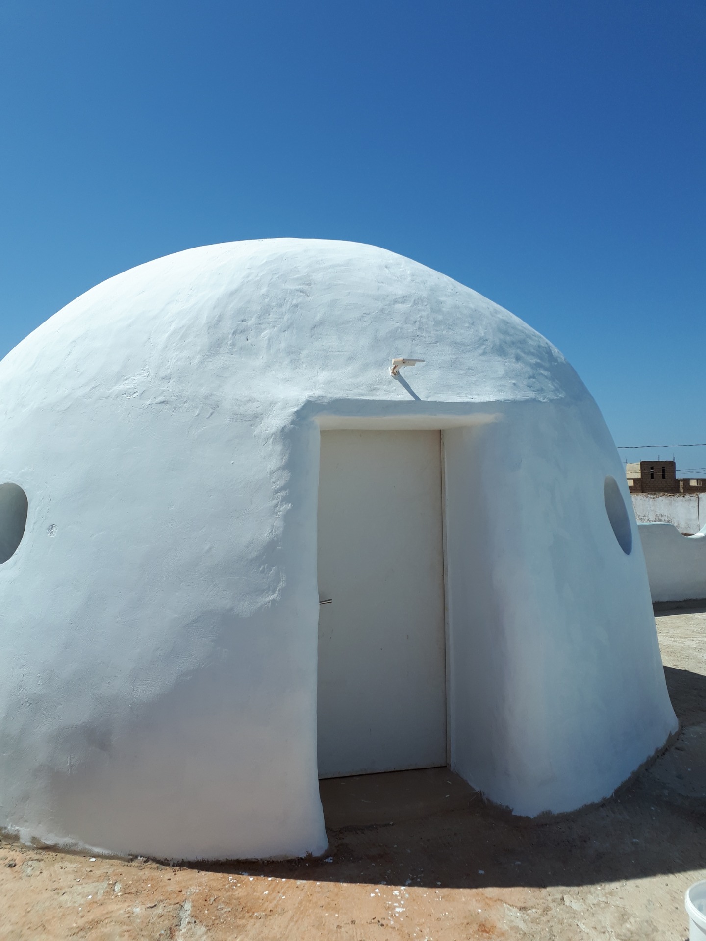 Cet édifice est entièrement composé de sacs de terre. Pas un clou, pas une poutre en bois, pas une brique, ... isotherme, ignifuge et antisismique... Sa charte écologique : voilà son secret.