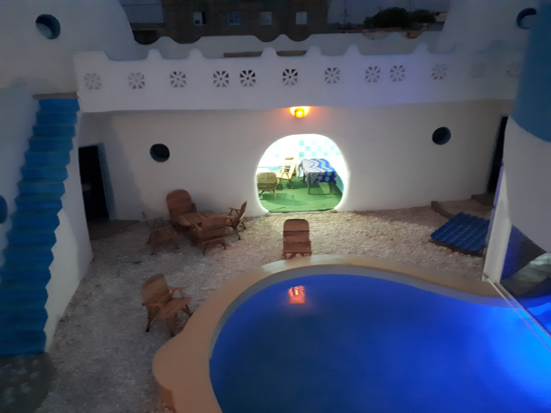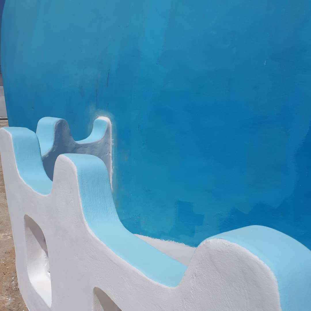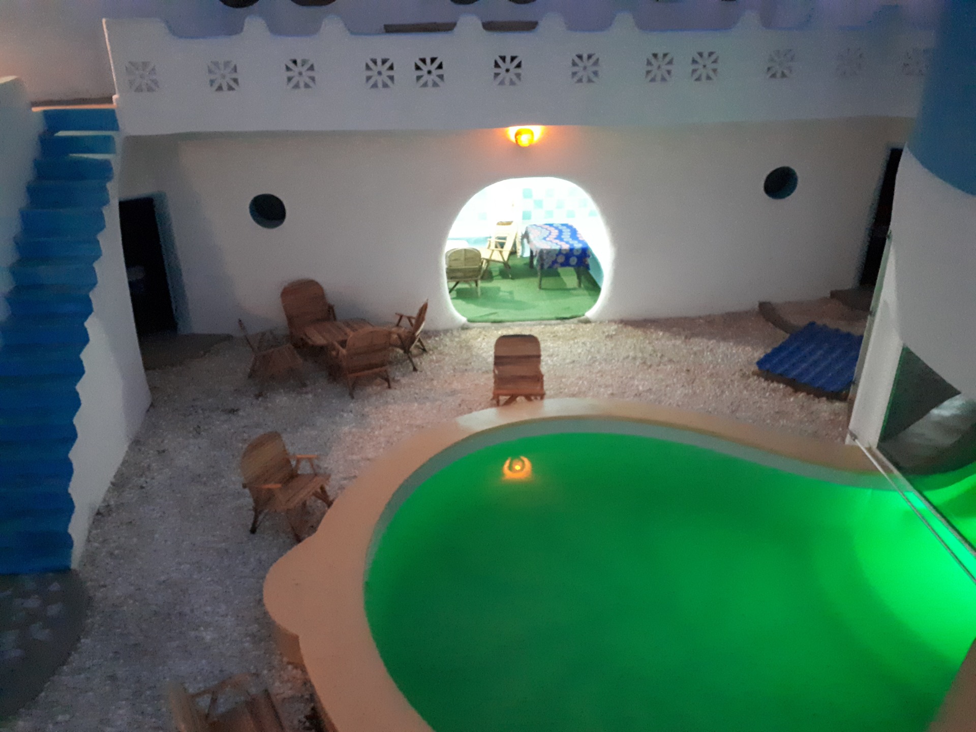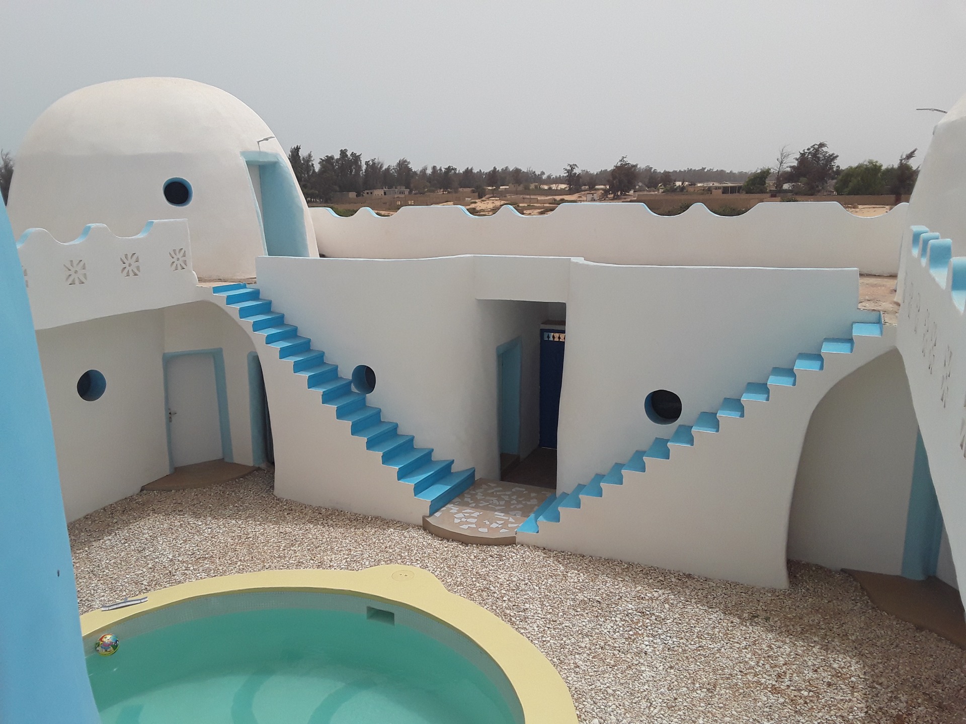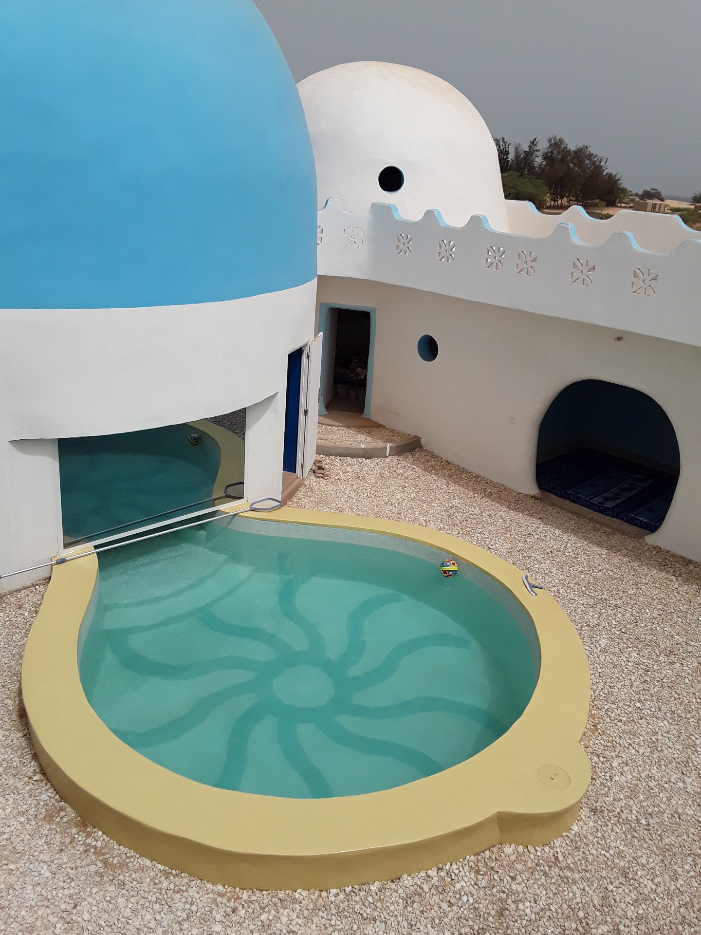 Pour le partage, il y a tout le reste... je vous le livre en vrac : la piscine, bien sûr. Source surgie du sable comme un mirage. Même si la plage est à deux pas, son bleu azur plonge le patio dans l'illusion parfaite de la fraîcheur. Le mieux est d'y plonger... puis prolonger sa brasse dans l'étroit passage qui mène dans le petit bain, sous le grand dôme. C'est le plus court chemin pour accéder au bar.