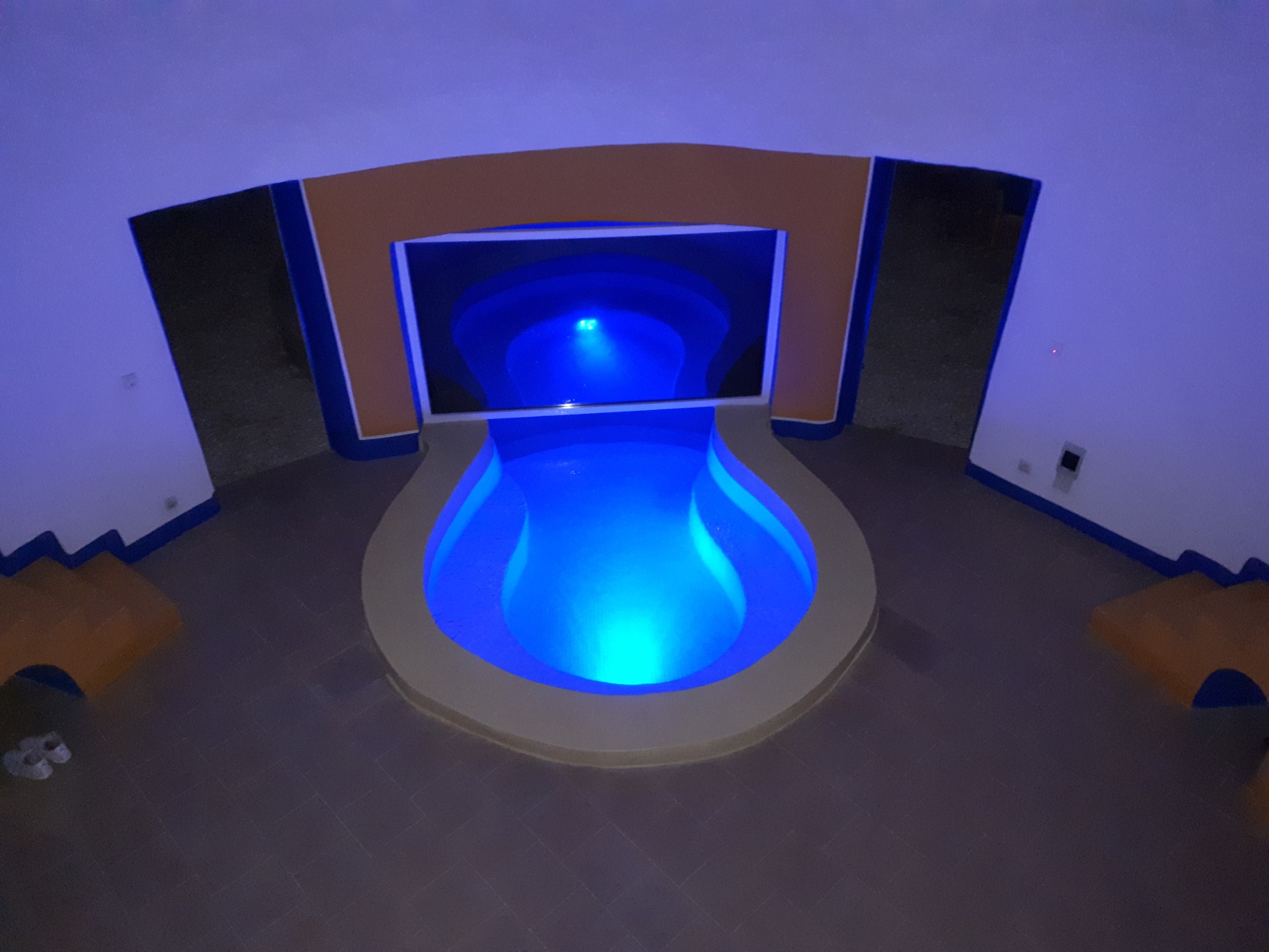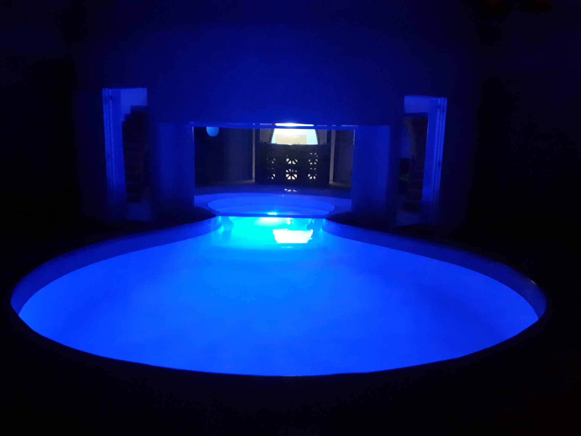 Oserais-je évoquer le chatoiement irisé de la piscine qui scintille dans la pénombre, sur le fond blanc du dôme.
