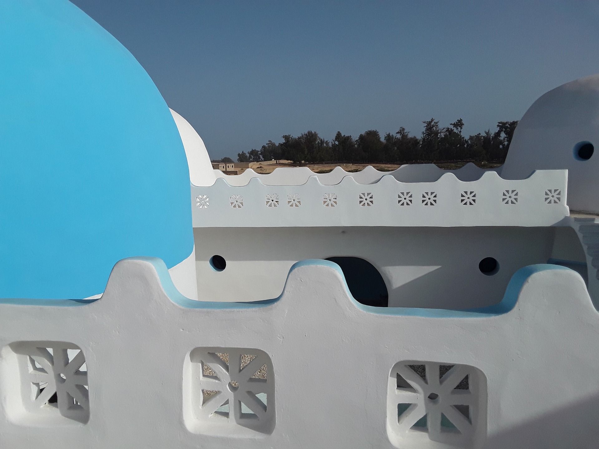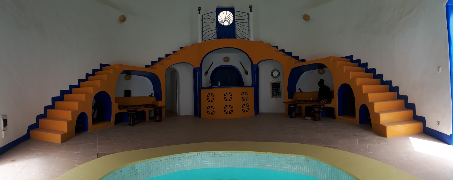 remarquez ce petit balcon juste au-dessus du bar, accessible par la terrasse arrière. Les amis musiciens de Seydou y font merveille avec l’acoustique du grand dôme... et je ne vous parle pas du léger clapotis de la piscine qui roule sur les parois comme une onde de fraîcheur.